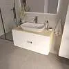 Подвесная тумба под накладную раковину – современное минималистичное решение для ванной. Плавные скругленные края, белый фасад с древесным корпусом символизируют гармонию, создают ощущение легкости и безопасности. Это особенно актуально в ванной комнате, где важно чувствовать себя комфортно и расслабленно.