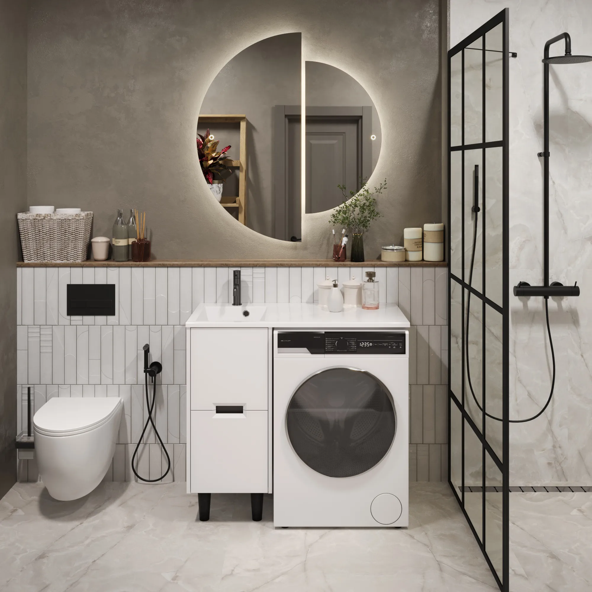 Тумба под раковину* Maid – элегантное решение "2-в-1", которое объединяет функциональность и стиль, позволяя гармонично разместить раковину и стиральную машину в ванной комнате. Белый цвет легко сочетается с другими цветами и стилями интерьера, предоставляя свободу в оформлении ванной комнаты. Акцентные опоры  черного цвета гармонично дополнят ваш выбор: строгая графитовая или нежная белая раковина – для создания неповторимого стиля ванной комнаты.