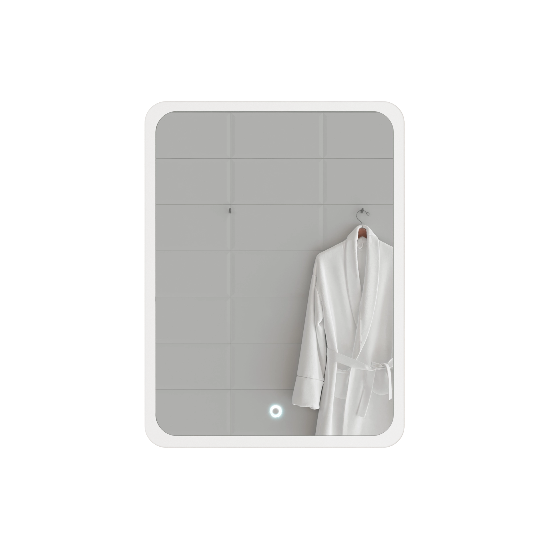 Невесомое, стильное, идеально подходящее практически для любой ванной комнаты, это зеркало сочетает в себе классический дизайн с современных технологиями, которые превращают его в функциональный технологичный объект. Зеркало имеет универсальную прямоугольную форму с мягкими краями, а также оснащено подсветкой, которой легко управлять с помощью выведенной на лицевую панель кнопки. Приглушенный белый свет, излучаемый зеркалом по всему периметру, мягко и деликатно освещает ванную комнату, создавая  в ней особенно уютную атмосферу, которая прекрасно располагает к расслабляющим процедурам.